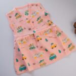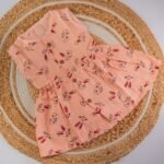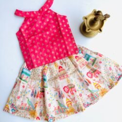 Raw Silk & Cotton Printed Frock Set for Girls – Pink & Cream with Back Bow Design