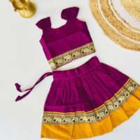 Traditional Raw Silk Pattu Frock Set for Girls – Green & Purple with Back Bow Design