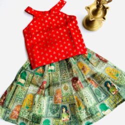 Traditional Raw Silk Pattu Frock Set for Girls – Red & Green with Back Bow