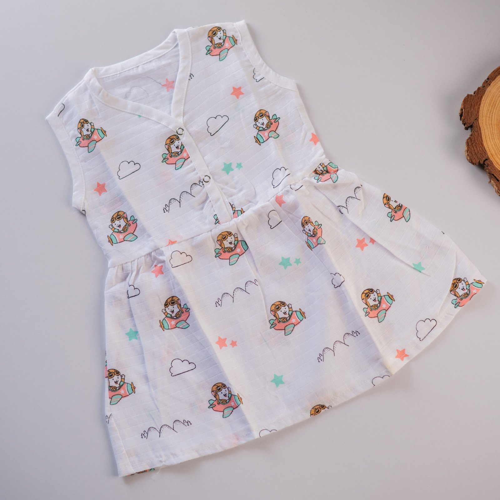 Crafted from soft, breathable muslin, this sleeveless frock adds a pop of color and charm—perfect for keeping cool and stylish all day.