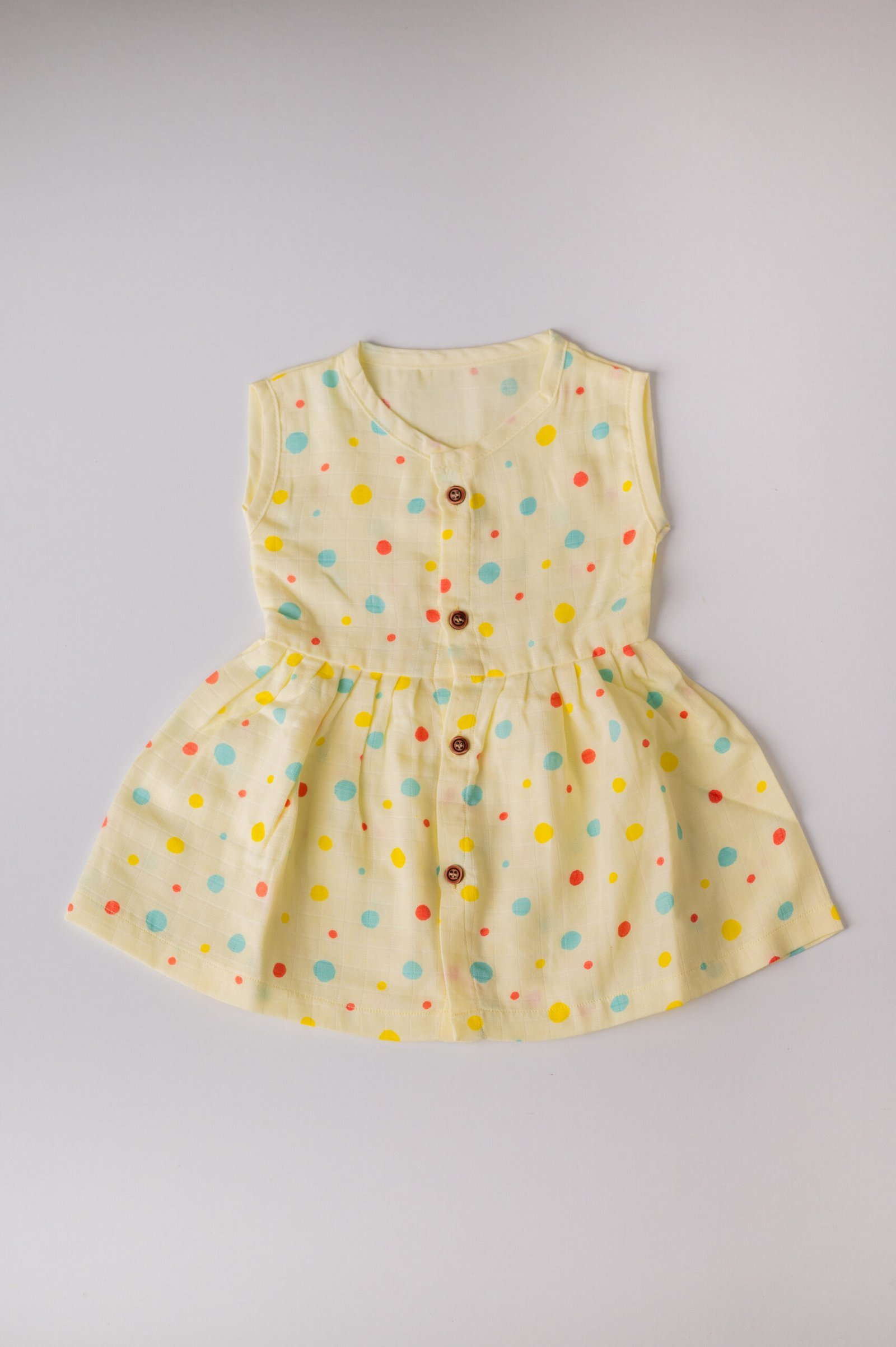 Crafted from soft, breathable muslin, this sleeveless frock adds a pop of color and charm—perfect for keeping cool and stylish all day.