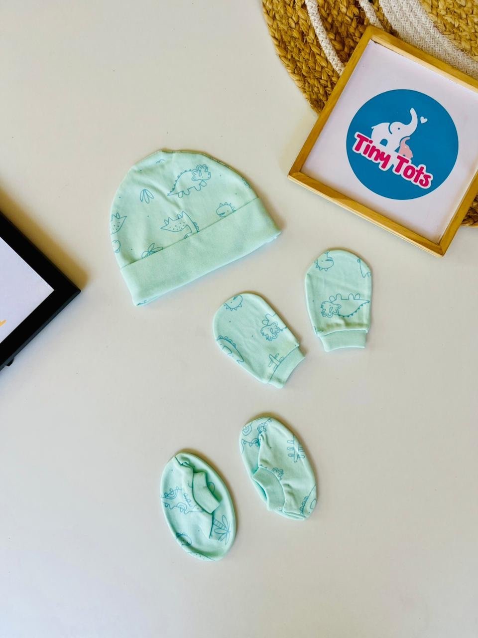 Soft cotton cap, mittens, and booties set for babies — keeps your little one cozy, warm, and comfortable.