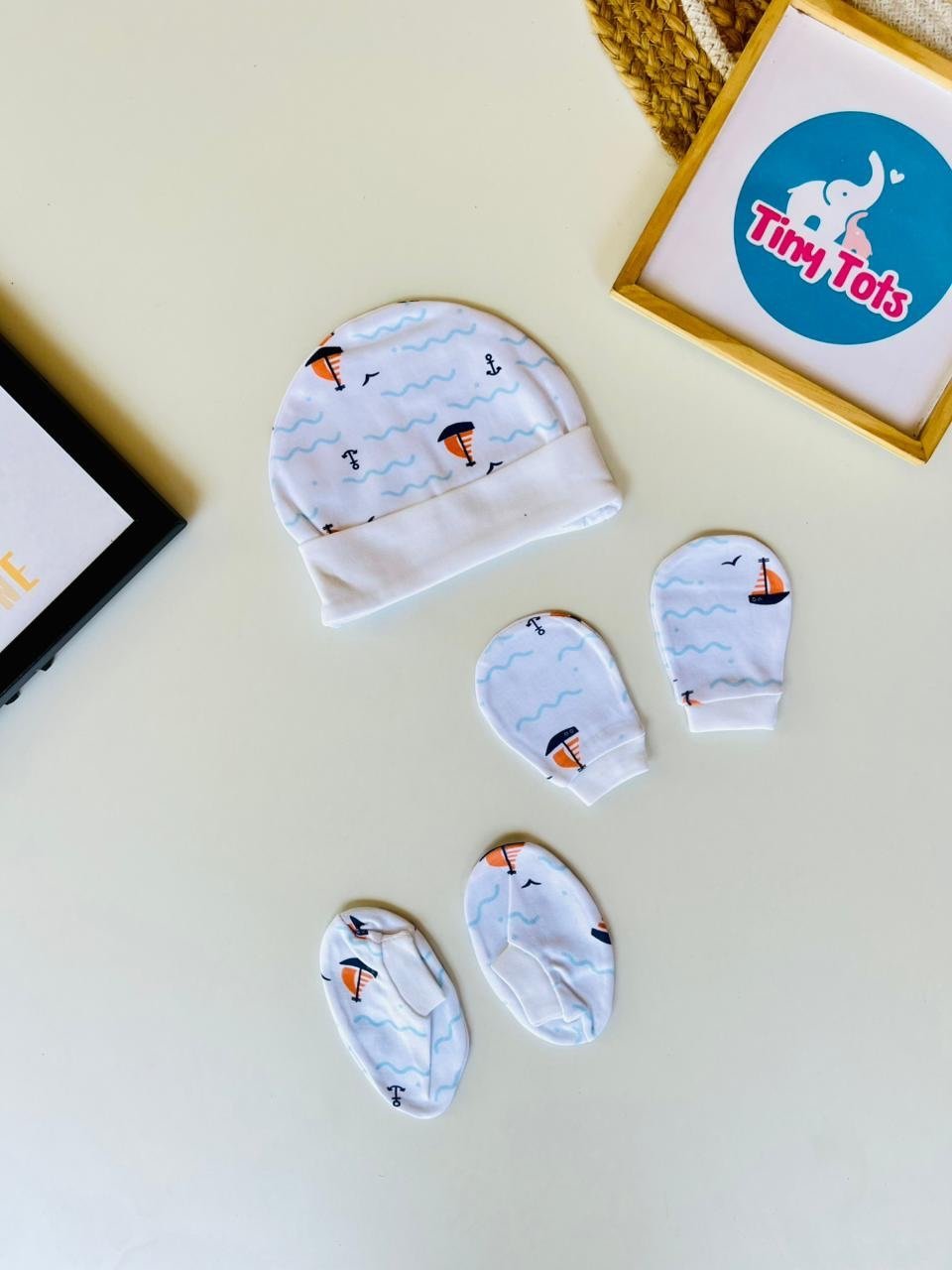 Cap,Mittens and Booties – White Boat