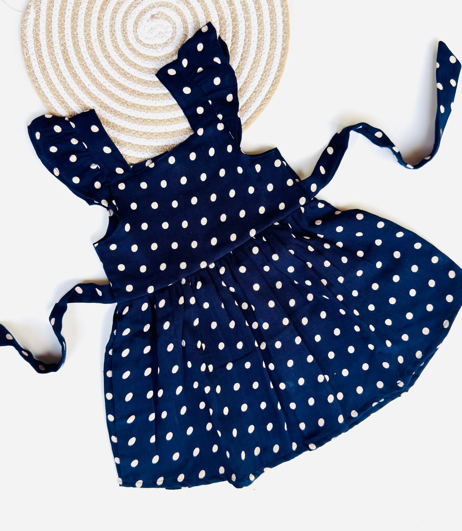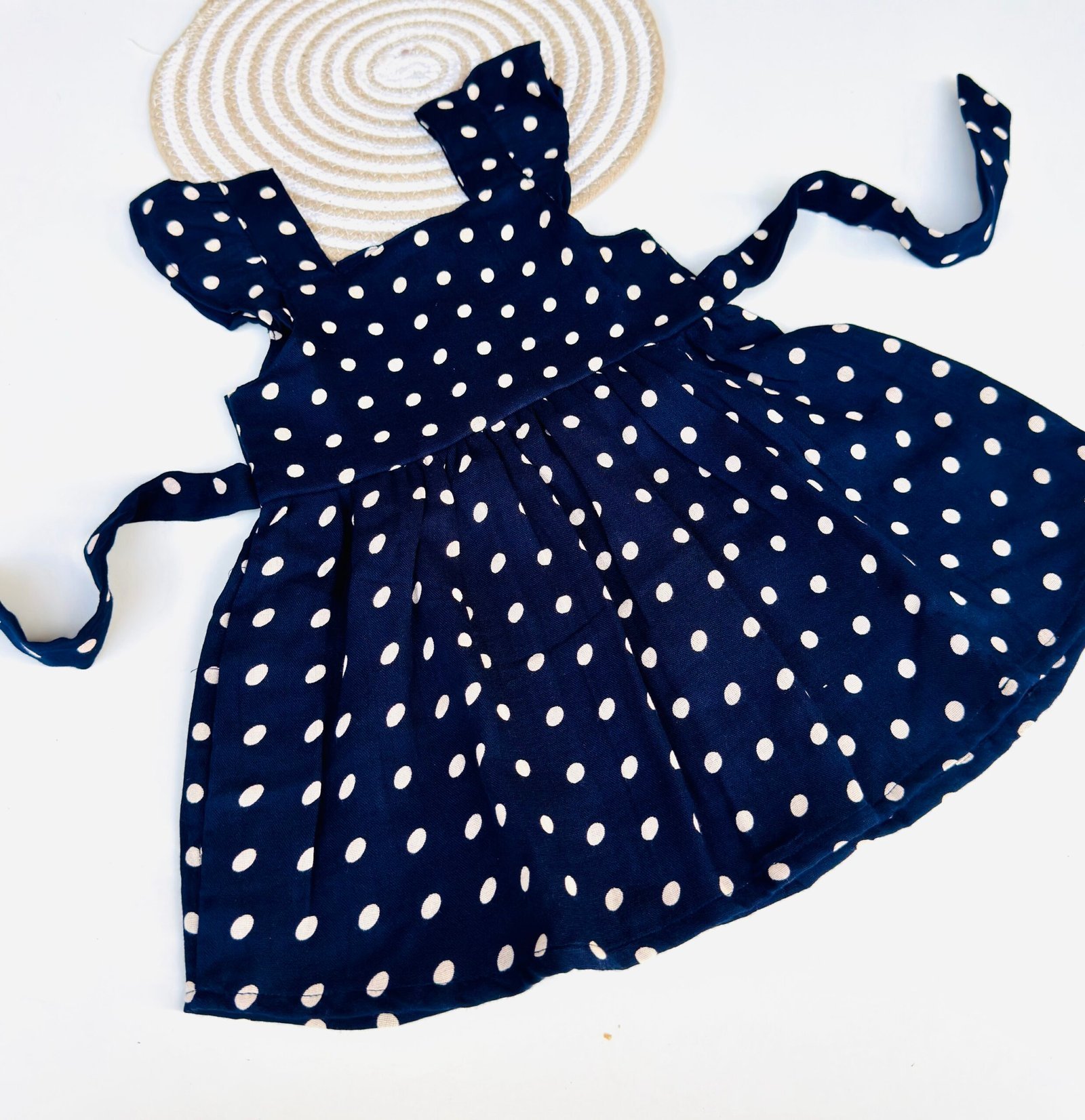 Cute navy blue polka dot frock with frilled straps – Back Button Frock