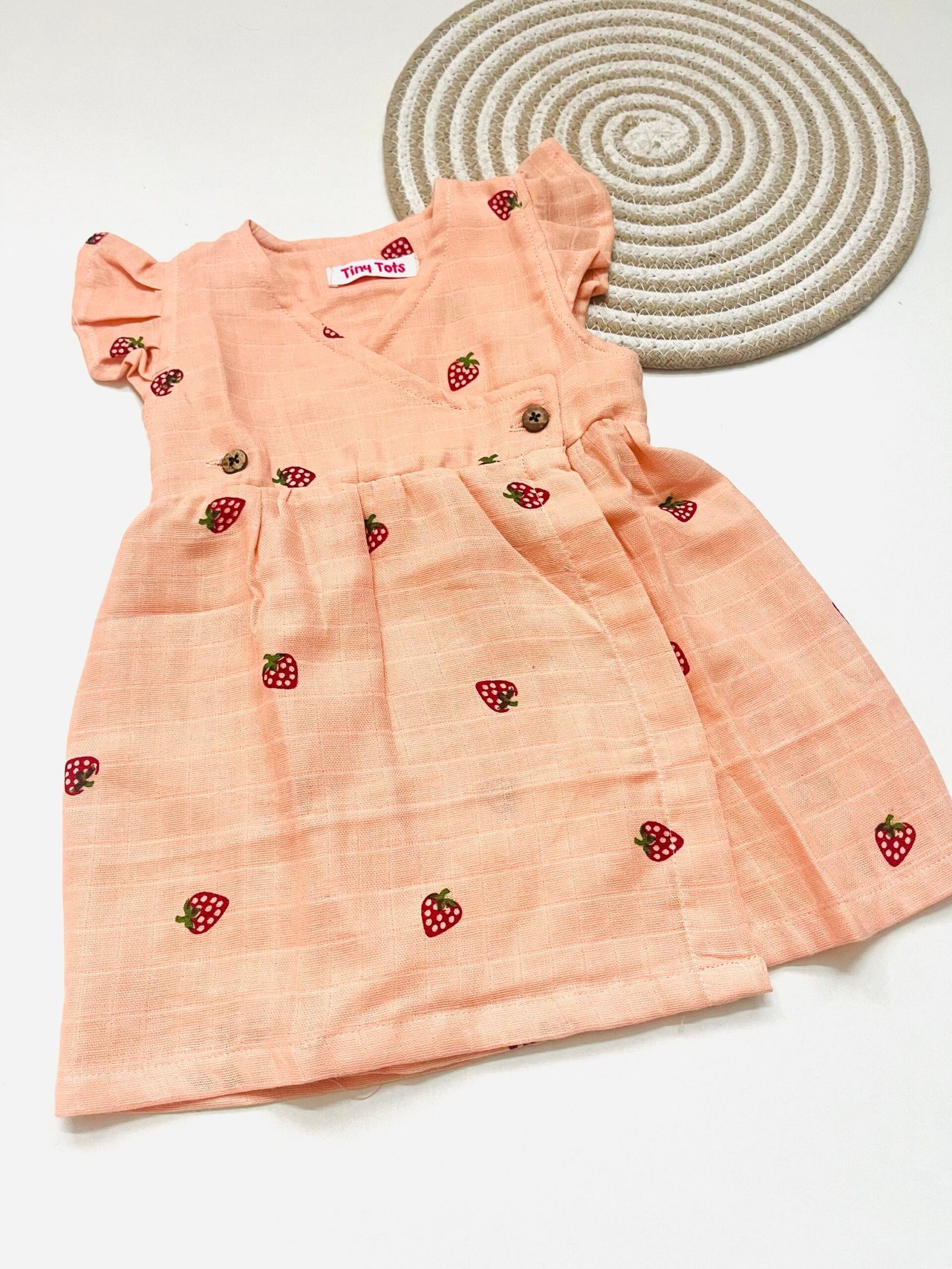 Adorable Peach muslin crossover frock designed with tiny strawberry prints for a charming look. Made from soft, breathable muslin fabric to keep your little one comfortable all day long. The dress is designed with cute ruffle sleeves and decorative wooden-style buttons on the bodice, adding a touch of warmth and detail. Its soft, breathable fabric and gently gathered skirt ensure all-day comfort and effortless style. Ideal for birthdays, outings, and festive celebrations.