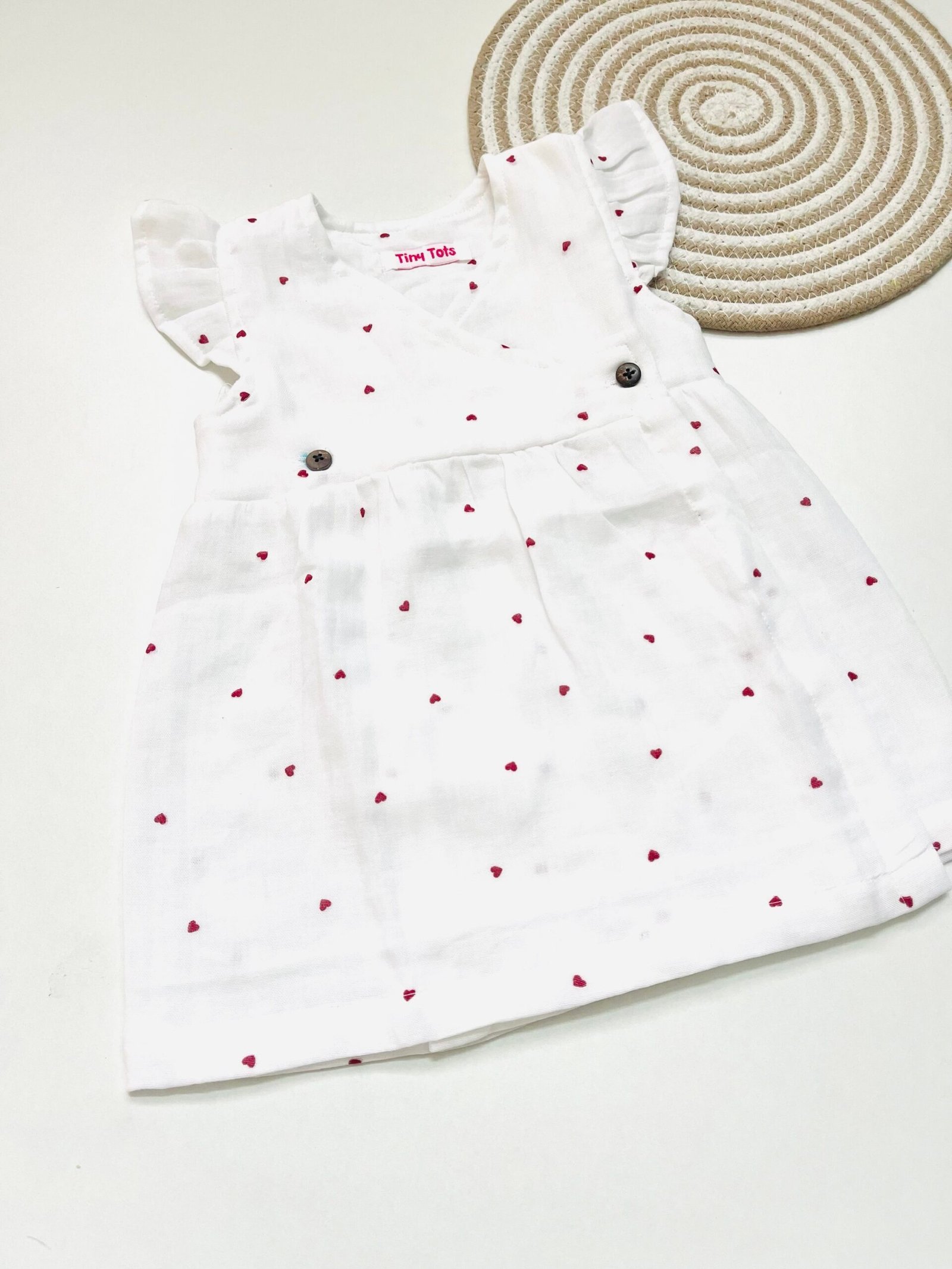 White with red heart print frock – adorable muslin frock cute strawberry embroidery soft puff sleeves and wooden button details for your baby’s everyday comfort and charm.