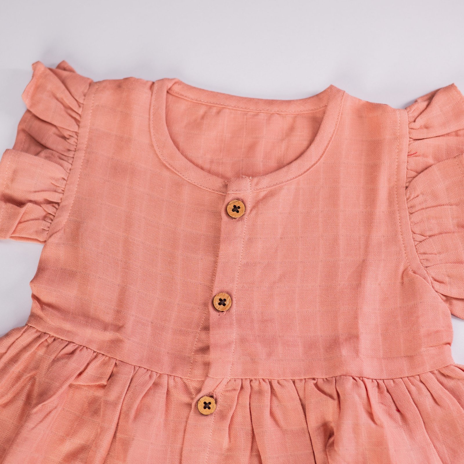 Peach Muslin Baby Frock with Wooden Buttons – Soft & Stylish